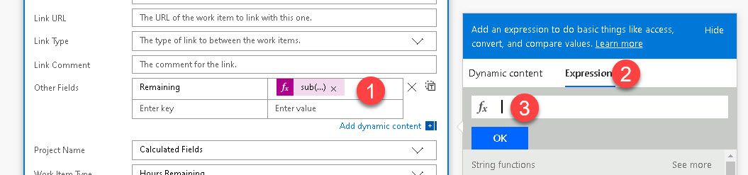 sub(triggerBody()?['Fields']?['Custom_StartNumber'],triggerBody()?['Fields']?['Custom_UsedNumber'])Where the command sub is subtract. The command trigerbody is the outputs from the previous step. I want to access the fields and in particular the custom fields Customer_StartNumber and Custom_UsedNumber. Notice that these are the full Azure DevOpos field names but with the . seperator replaced with the _ seperator.