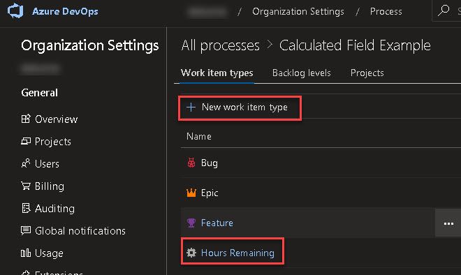 I created a new workitem type called "Hours Remaining" for this example. If you were doing this for the standard workitem types (bug, task, userstory, etc) then you'll need to add the custom fields to each workitem template.