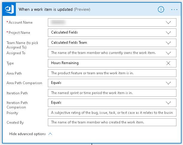 Now you can edit the trigger screen. Choose your project, team and workitem type. It's a bit clunky if you need this for multiple projects and workitem types. There may be a better way? If so, let me know in the comments! Notice that the "Type" is a dropdown, but mine is a customer type so I typed "Hours Remaining".