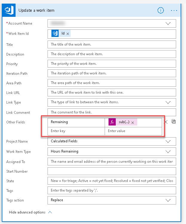 Then click the + to add another box "update a work item" and click the option to "show advanvced options". Fill out the values as before (organmisation, project, type). The interesting bit comes next which is where we use an expression to do the maths on my custom fields.